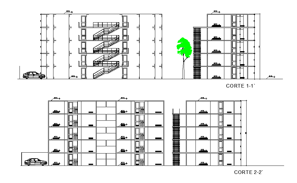 Section view of the 66x44m apartment building plan is given in this Autocad drawing file. Download the Autocad file.