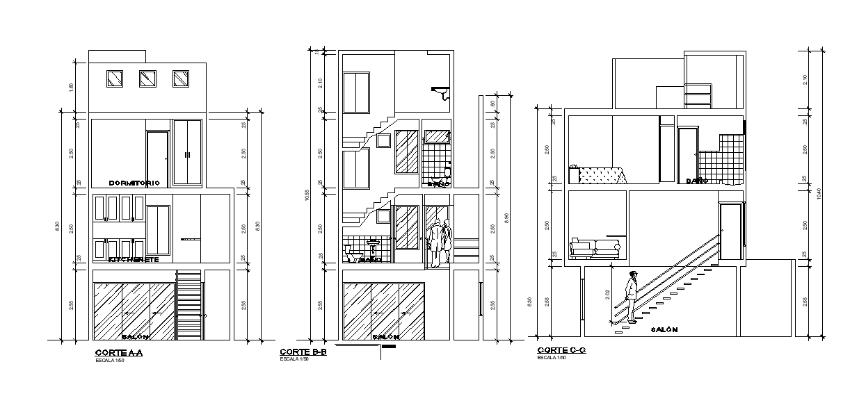 Section view of the 5x7m guest house plan is given in this Autocad drawing file. Total height of the building is 10.14m. This is G+2 house plan. In this plan, kitchen, bathroom, living room, master bedroom, kid’s room and common toilets are available. For more details download the Autocad drawing file. Thank you for downloading the 2D Autocad file and other CAD program files from our website.