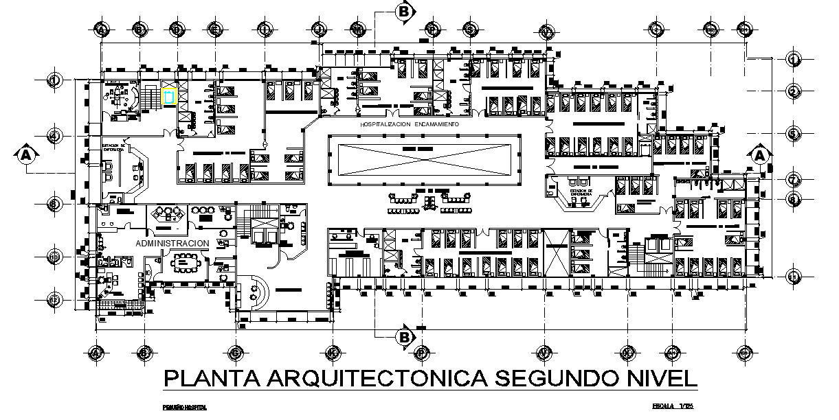 72x26m hospital plan is given in this Autocad drawing file. Download the Autocad DWG file.