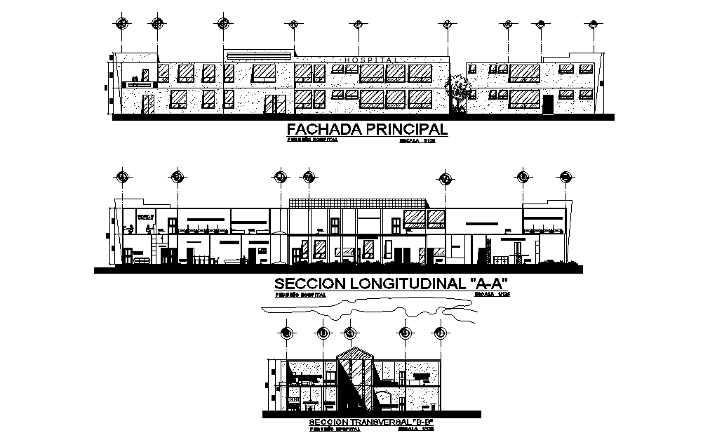 Section view of the 72x26m hospital plan is given in this Autocad drawing file. Download the Autocad DWG file.