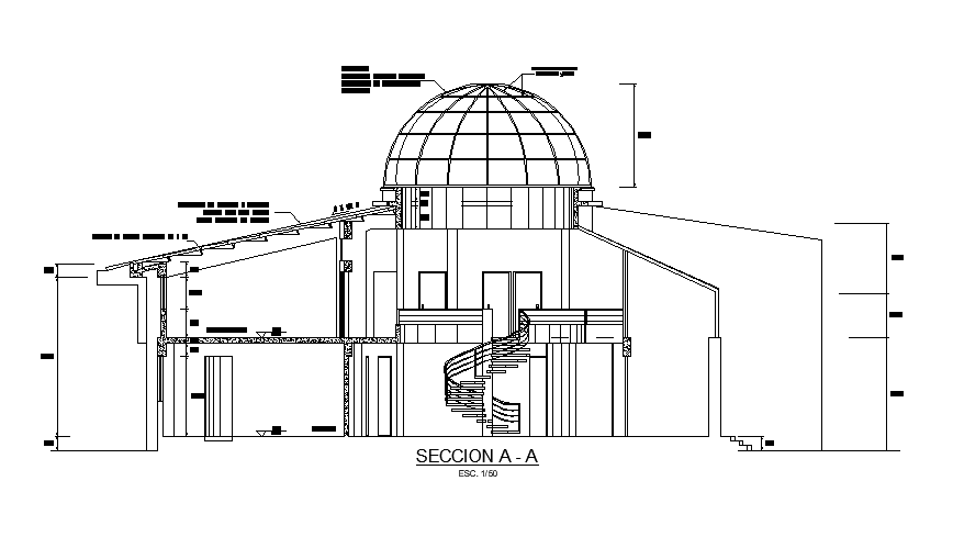 the architecture dome hotel building section CAD drawing which includes translucent roof-tubular section structure square (see detail) polycarbonate cover color celeste, asbestos coverage - cement eternity type tile on wood joist. the dome tubular structure, cover translucent polycarbonate and wood Joist Screw 2 "x 6". Thank you for downloading the AutoCAD file and other CAD program from our website.