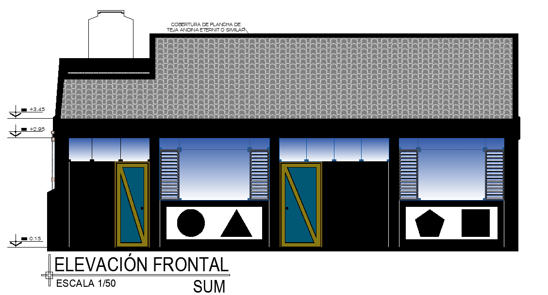 An Elevation view of the small restaurant is given in this Autocad DWG drawing file. The total height of the building is 5.5m. In this section view sum dining room, rain drain, service patio, pantry, kitchen are available. For more details download the Autocad drawing file. Thank you for downloading the Autocad drawing file and other CAD program files from our website.