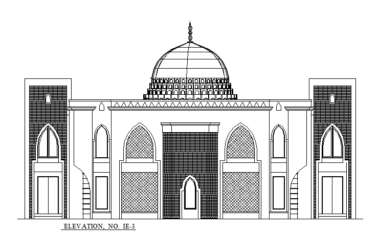 the mosque front elevation design AutoCAD drawing which includes window detail and huge arch detail with texture marble tile and dome on the top of building design. Thank you for downloading the AutoCAD file and other CAD program from our website.
