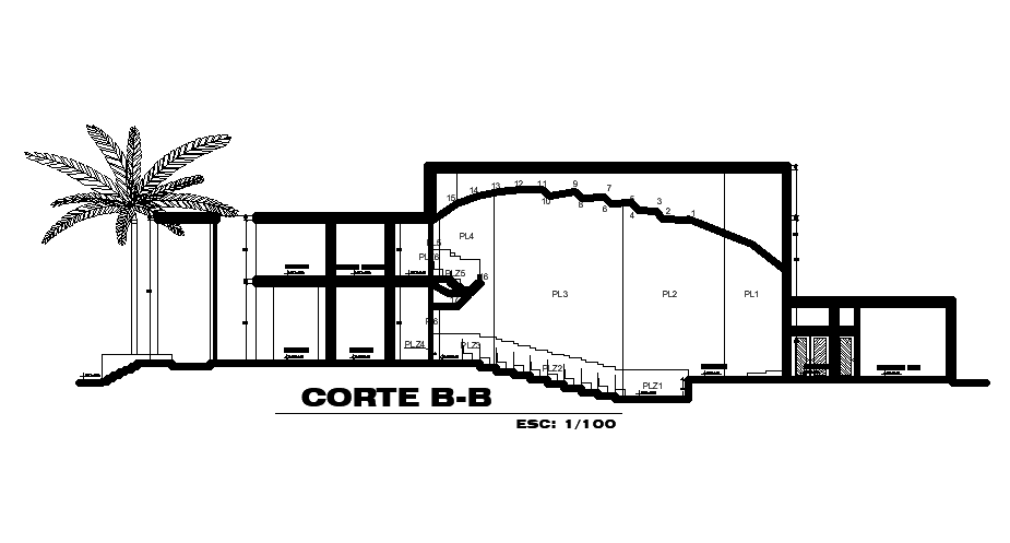 Right side Section detail of Museum amphitheater drawing specified in this AutoCAD file. Download this 2d AutoCAD drawing file.