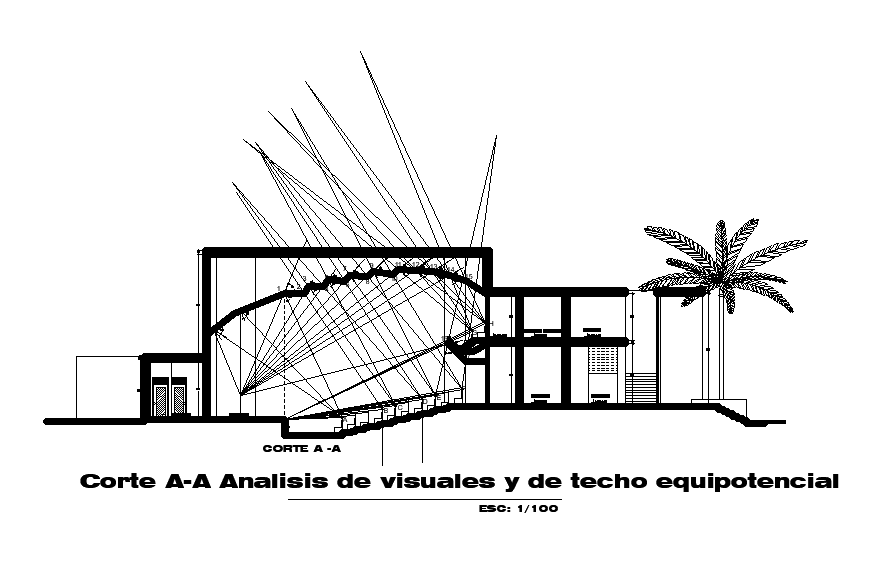 Amphitheater sitting left side section detail drawing specified in this AutoCAD file. in this file services and utilities detail presented with the process drawings. In this drawing, you will have an amphitheater, lounge, hall, small restaurant, waiting and meeting area and administrative offices, parking, and services. Download 2d AutoCAD drawing DWG file detail.