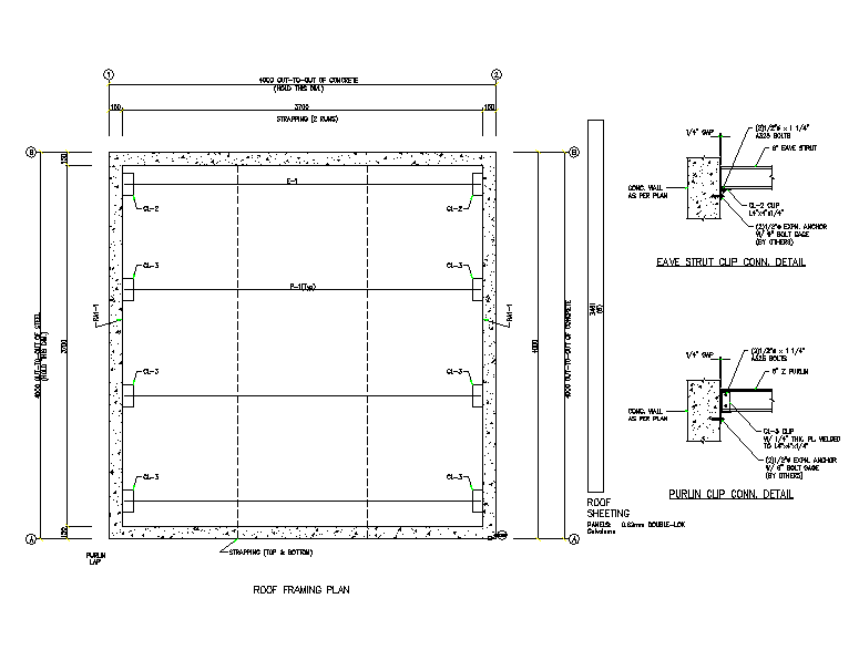 Roof Framing Plan.Roof Seating, purlin clip conn. detail, out-to-out of concrete, Structure detail. section detail.