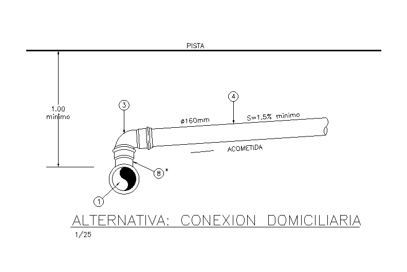 Alternative home connection drawing defined in this AutoCAD file. In this drawing pipe details with 1: 25 scale Dimensions and specifications detail also presented in this AutoCAD drawing file. this can be used by architects and machinery detail. Download this 2d AutoCAD drawing file.