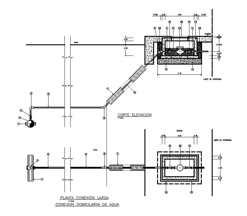 Long connection plant home water connection derived in this AutoCAD file. Download this 2d AutoCAD drawing file.