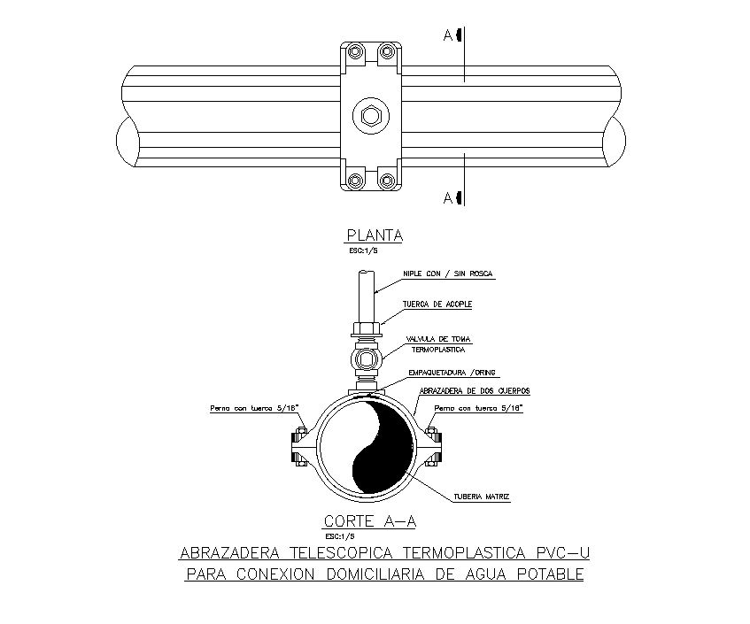 Thermoplastic telescopic detail drawing stated in this AutoCAD file. In this drawing pipe details with 1: 5 scale Dimensions and specifications detail also presented in this AutoCAD drawing file. this can be used by architects and machinery detail. Download this 2d AutoCAD drawing file.
