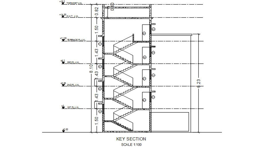 A key section view of the staircase is given in this Autocad drawing file. Total height of the staircase of 4 floors is 6.23m. For more details download the Autocad drawing file. Thank you for downloading the Autocad drawing file and other CAD program files from our website.