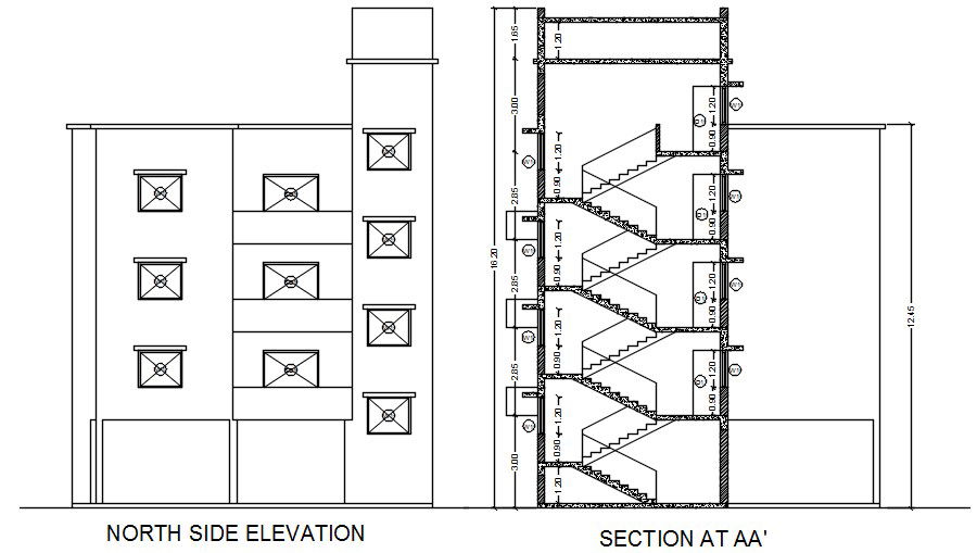 Final vad signs section view is available in this Autocad drawing file. An elevation of the building is given. Total height of the building is 16.20m. North side elevation view is given. This is G+3 building. For more details download the Autocad drawing file. Thank you for downloading the Autocad drawing file and other CAD program files from our website.