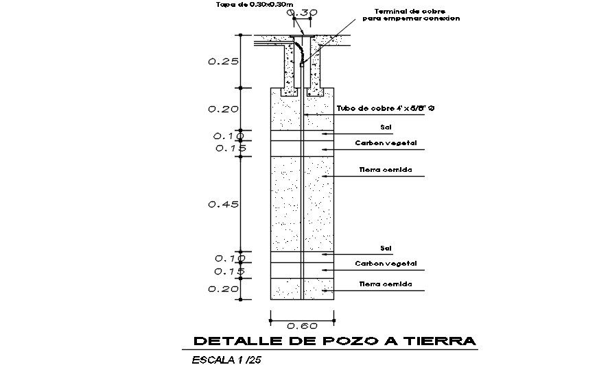 Well to ground detail is presented in this Autocad drawing file. A detail is from wall to ground level. 0.30x0.30m cap, Copper terminal for bolting connection, Copper tube 4 'x 5/8 "Ø, Charcoal, Salt, Sifted earth, Sifted earth are mentioned in this drawing model. For more details download the AutoCAD drawing file. Thank you for downloading the autocad drawing file and other cad program files from our website.