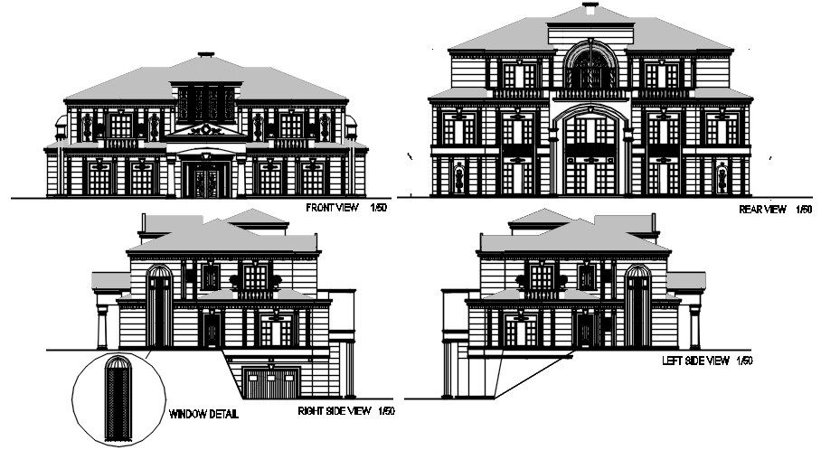 An elevation view of the Floor plan of the luxury villa is presented in this Autocad drawing file. This is G+2 villa house. In basement floor Turkish bath, sauna, common water closet, fitness, garden, maid room with attached toilet, laundry room, garage, elevator, hall, driver room are available. In the ground floor dining hall, entrance room, master bedroom with attached bathroom, entrance hall, corridor, cloakroom, dressing room, pantry, living area, gallery, guest room with attached bathroom, family dining hall, kitchen elevator are available. Master bedroom with dressing room, furniture’s setup & bathroom, guest bedroom with dressing room, furniture’s setup & bathroom, kid’s bedroom with dressing room, furntiure’s setup & bathroom, gallery, way to terrace and master bedroom 1 with dressing room, furniture’s setup & bathroom and other details are given. For more details download the AutoCAD drawing file. Thank you for downloading the autocad drawing file and other cad program files from our website.