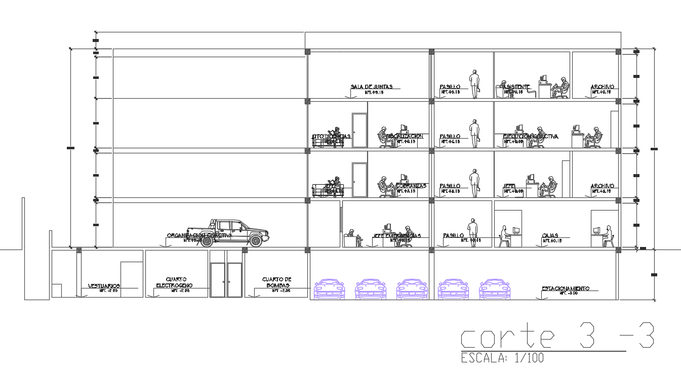 the municipal administration office building section CAD drawing that collection department, informatics office, methodology and documentation unit detail. also has cross furniture section and 12 meter height of building with basement parking section view drawing DWG file. Thank you for downloading the AutoCAD file and other CAD program from our website.