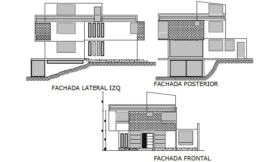 Elevation of 11x16m house plan is given in this Autocad drawing file. This is G+2 house building. In the basement floor car parking is available. In the ground floor kitchen, dining, living area, common toilet, and family lounge are available. In the first floor 4 bedrooms, with attached toilet, common toilet, and family lounge are available. For more details download the Autocad file. Thank you for downloading the Autocad file and other CAD program files from our website.
