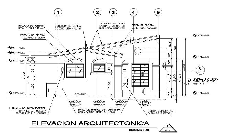 House architectural elevation design which includes single storey roof covering lamina pre-painted pend 17%, masonry wall confined with hair and fine finish, external wall luminaire, h = 1.80 m, model to choose by the customer, metal door, see door table and window of celosia aluminum and glass. the total 3.88 meter height of building model design DWG file. Thank you for downloading the AutoCAD file and other CAD program from our website.