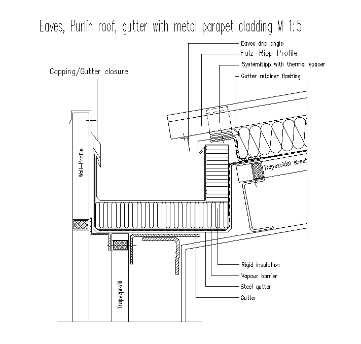 the roof gutter retainer flashing section CAD drawing which includes eaves, Purlin roof, gutter with metal parapet cladding, Capping / Gutter closure, gutter retainer flashing and eaves drip angle detail. also has roof cut slopping view. Thank you for downloading the AutoCAD file and other CAD program from our website.
