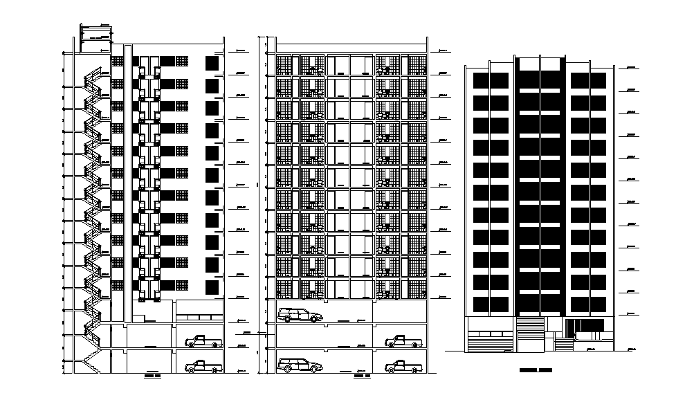 Apartment buildings plan architecture section of 37x18m apartment building plan is given in this Autocad drawing model. This is G+12 apartment building plan. In this four houses are available in each floor. Three floors are provided for car parking. Living room, kitchen, dining, and master bedroom with attached toilet, kid’s bedroom, lavenderia, study room and common toilet is available in each house. For more details download the Autocad drawing file. Thank you for downloading the Autocad drawing file and other CAD program files from our website.