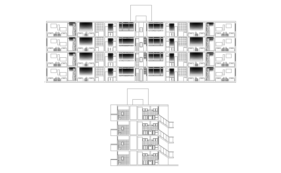 Section view of G+3 apartment building plan is given in this Autocad drawing file. Download the Autocad file.