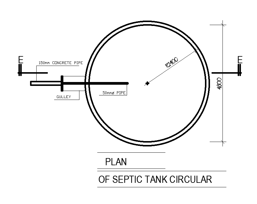 Plan of circular septic tank is given in this Autocad drawing model. Diameter of the septic tank is 4.8m. Gulley, 50mm diameter of pipe, 150mm concrete pipe, and height of the septic tank is 4.8m are mentioned in this drawing model. For more details download the Autocad drawing file. Thank you for downloading the Autocad file and other CAD program files from our website.