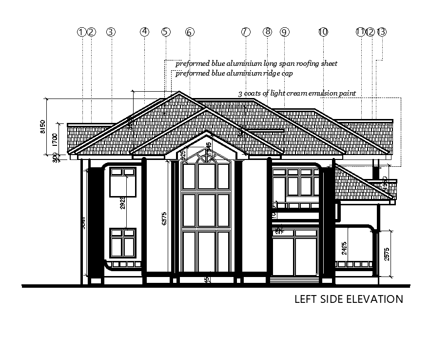 Left side elevation of the 17x17m ground floor house plan is given in this Autocad drawing file. Download the Autocad drawing file.