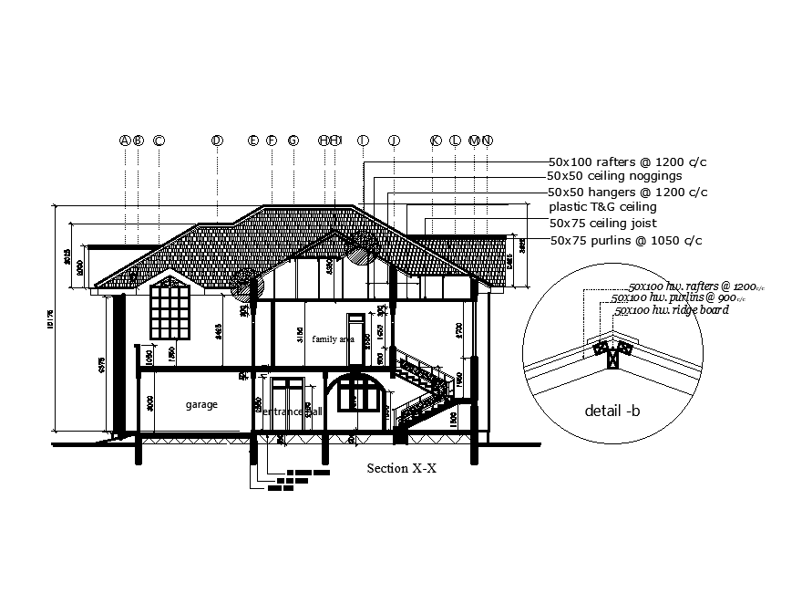 Section view of 17x17m ground floor house plan is given in this Autocad drawing file. This is G+1 house plan. Garage, kitchen, terrace, entrance hall, living area, dining area, master bedroom with attached toilet, study room and guest bedroom with attached bathroom are available in the ground floor. Kitchen, family area, terrace, common toilet, store room, master bedroom with attached toilet, and guest bedroom with attached bathroom are available in the first floor. For more details download the Autocad drawing file. Thank you for downloading the Autocad file and other CAD program files from our website.