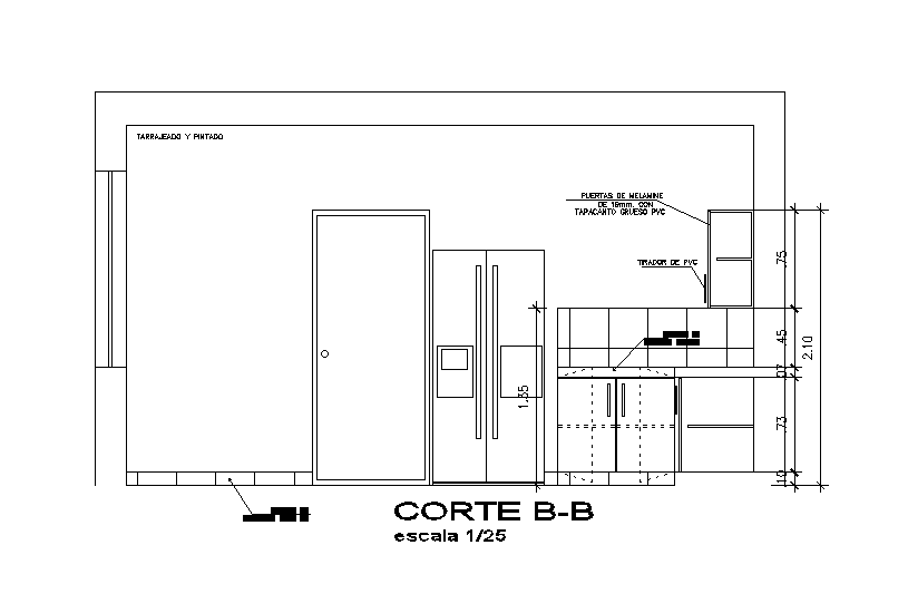 This drawing stated the front elevation detail of the kitchen. full height refrigerators and platform material detail is given with dimensions and name detail also mentioned in this AutoCAD file. this can be used by architects and engineers. Download this 2d AutoCAD drawing file.