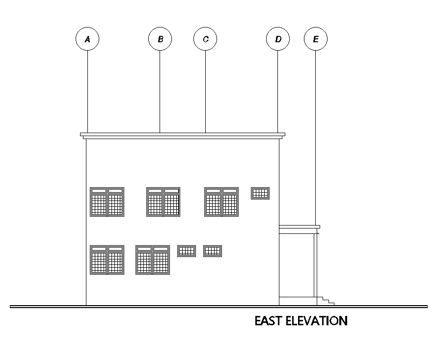 East side elevation of 26x12m office plan is given in this Autocad drawing file. Download the Autocad file.