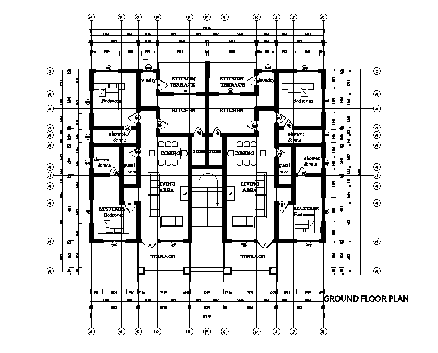 18x15m Ground floor plan of residential building is given in this Autocad drawing model. This is G+2 house plan. In each floor two houses are available. In the ground floor master bedroom with attached bathroom, & water closet for guest, kid’s room with attached shower & water closet, laundry, kitchen terrace, kitchen, living area, dining area, and store room are available. The above one is same for another home. For more details download the Autocad drawing file. Thank you for downloading the Autocad file and other CAD program files from our website.