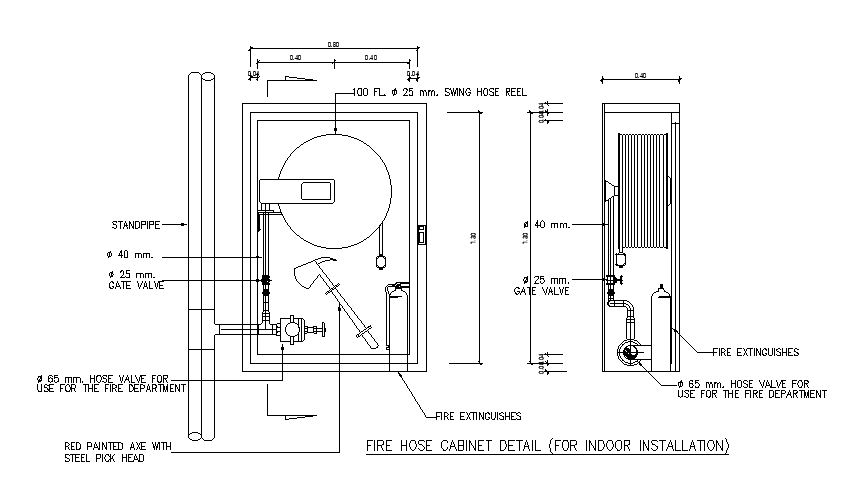 the fire house cabinet plan and side section CAD drawing that shows fire hose cabinet detail for indoor installation, red painted axe with steel pick head, ? 65 mm. hose valve for and fire extinguishes detail. Thank you for downloading the AutoCAD file and other CAD program from our website.