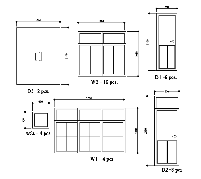 Door & windows detail of 15x14m residential building plan is given in this Autocad drawing model. This is G+1 house plan. There are three doors, and three windows are given. The dimension of D1 is 750x2100mm. The dimension of D2 is 900x2800mm. The dimension of D3 is 1600x2100mm. For more details download the autocad drawing file. Thank you for downloading the Autocad file and other CAD program files from our website.