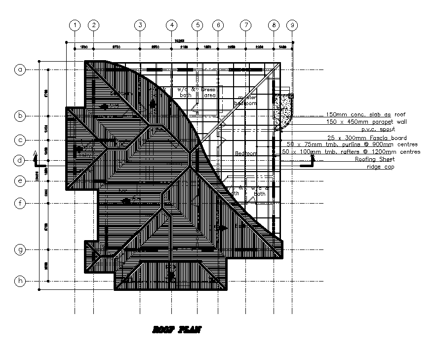 Roof plan of 18x17m ground floor of house plan is given in this Autocad drawing file. This is G+1 house plan. 150mm thickness of concrete slab, 150x450mm parapet wall, 50x75mm pulins, 25x300mm fascia board, roofing sheets, and ridge cap are mentioned. In this ground floor plan porch, water closet, living area, master bedroom with attached bathroom, kitchen, dining area, indry, store room, master bedroom with attached water closet & dressing area, kid’s room with attached toilet, corridor and guest room with attached toilet are available. For more details download the autocad drawing file. Thank you for downloading the Autocad file and other CAD program files from our website.