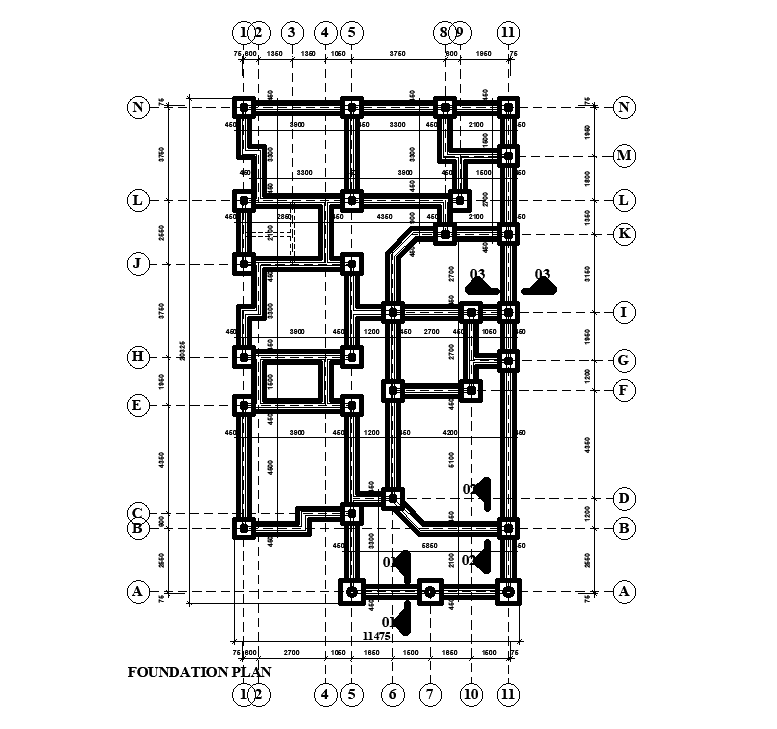 Foundation layout of 11x20m residential house plan is given in this Autocad drawing file. Download now.