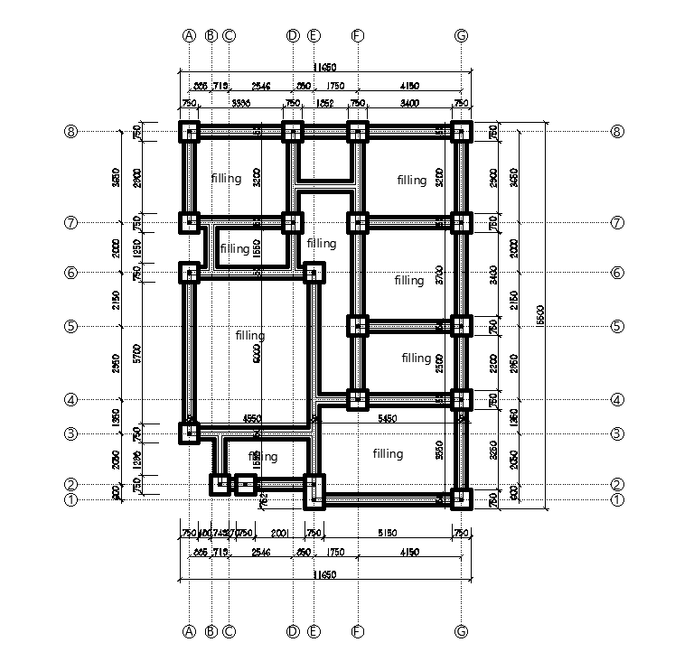 Foundation layout of 11x15m house plan is given in this Autocad drawing file. Download now.