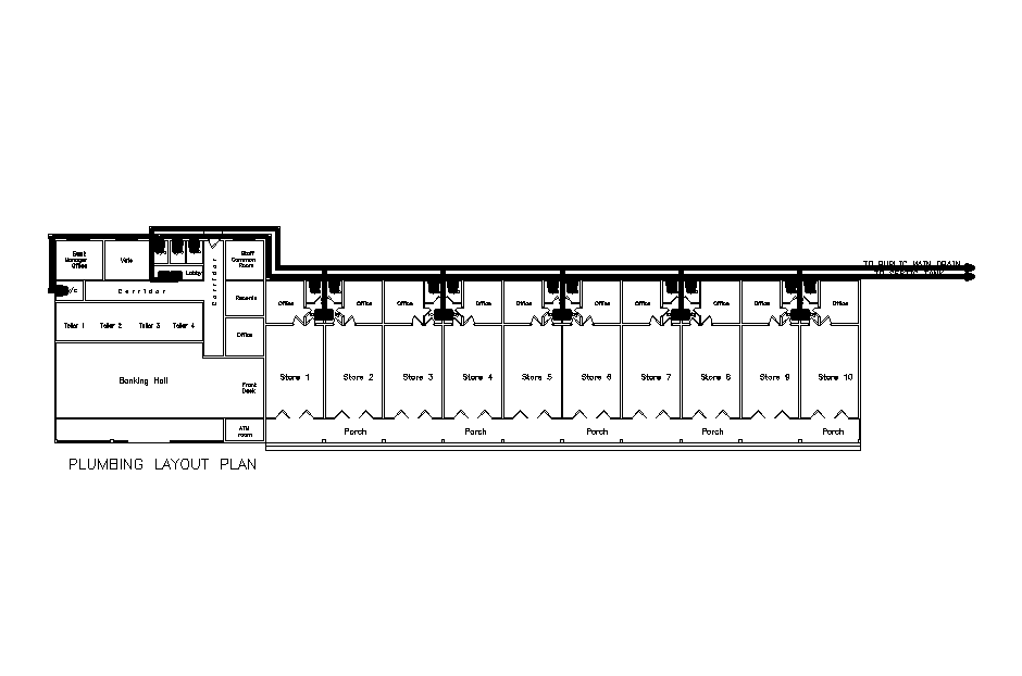 Plumbing layout of 63x16m bank office cum commercial shop is given in this Autocad drawing file. In this stores are given. This plan consists of porches, stores, banking hall, corridor, bank manager office, vote, lobby, staff common room, records room, office rooms, lobby, water closets, and ATM rooms are available. For more details download the autocad drawing file. Thank you for downloading the Autocad file and other CAD program files from our website.