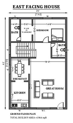 26'x41' East facing house plan as per Vastu shastra is given in this FREE 2D Autocad drawing file. The total built-up area of the plan is 1066sqft. In this floor plan master bedroom with attached bath, walk-in wardrobe, great room, breakfast, common bath, and kitchen are available.download this 2D Autocad drawing file.