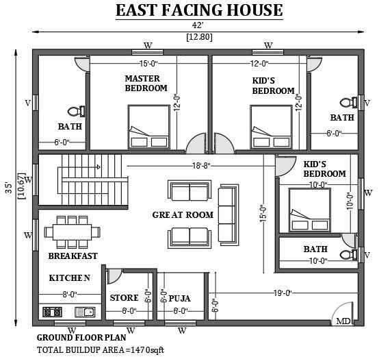 42'x35' East facing house plan as per Vastu shastra is given in this FREE 2D Autocad drawing file. The total built-up area of the plan is 1470sqft. In this floor plan master bedroom with attached bath, kid's bedroom with attached bath, common bath, storeroom, puja, great room, bedroom with attached bath, and kitchen are available.download this 2D Autocad drawing file.