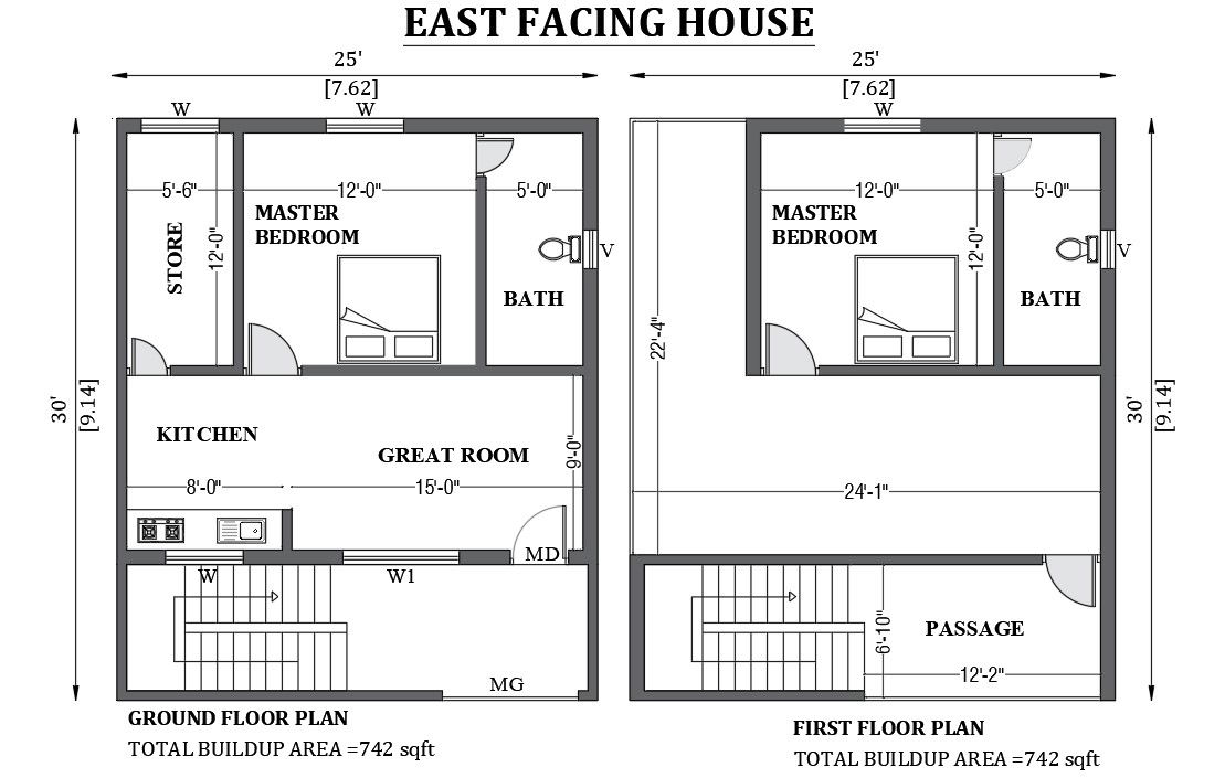 25'x30' East facing house plan as per Vastu shastra is given in this FREE 2D Autocad drawing file. The total built-up area of the plan is 742sqft. In this ground floor plan master bedroom with attached bath, store, great room, and kitchen are available, and on the first-floor plan master bedroom with attached bath, and sunroom are available.download this 2D Autocad drawing file.