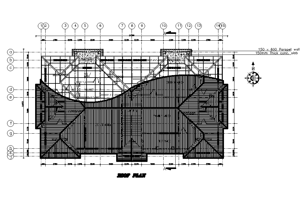 Roof plan of 25x15m ground floor plan of residential building is given in this Autocad drawing model. Download now.