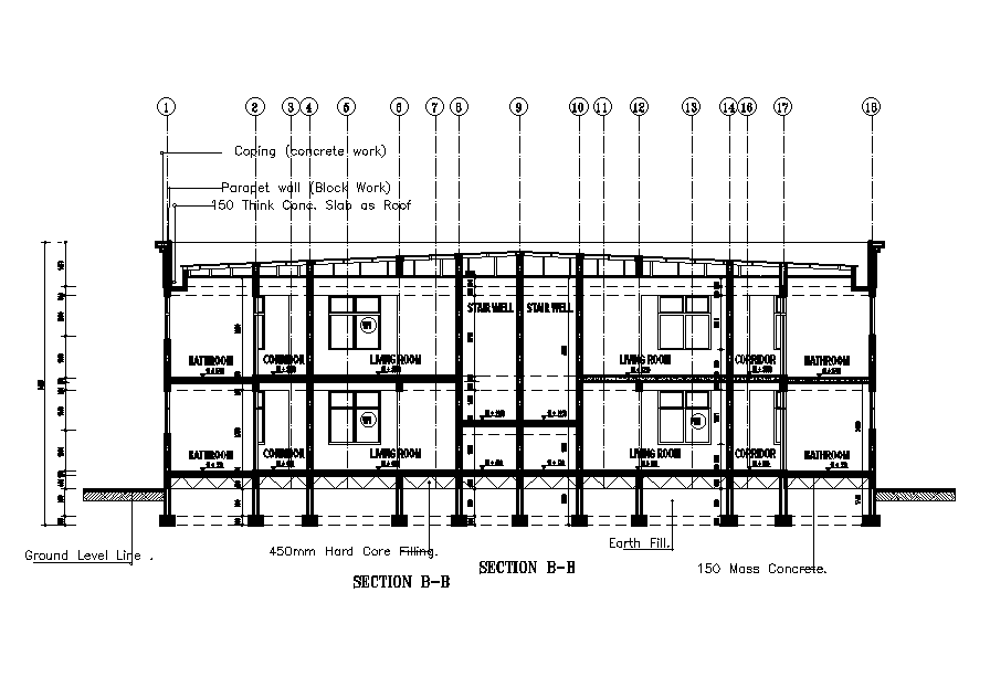A section view of the 24x12m residential plan is given in this Autocad drawing file. This is G+1 house plan. The total height of the building is 7.6m. Ground level line, 450mm hard core filling, earth filling, 150mm mass concrete, coping, parapet wall, and 150mm thickness of concrete slab and other details are given in this drawing. Entrance terrace, living room, kitchen, store room, dining area, bathroom with attached toilet, kid’s room with attached toilet, and entrance lobby are available in this ground floor. Above rooms are same for the first floor. For more details download the autocad drawing file. Thank you for downloading the Autocad file and other CAD program files from our website.