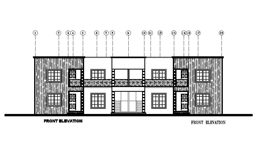 Front elevation of 24x12m residential plan is given in this Autocad drawing file. Download now.
