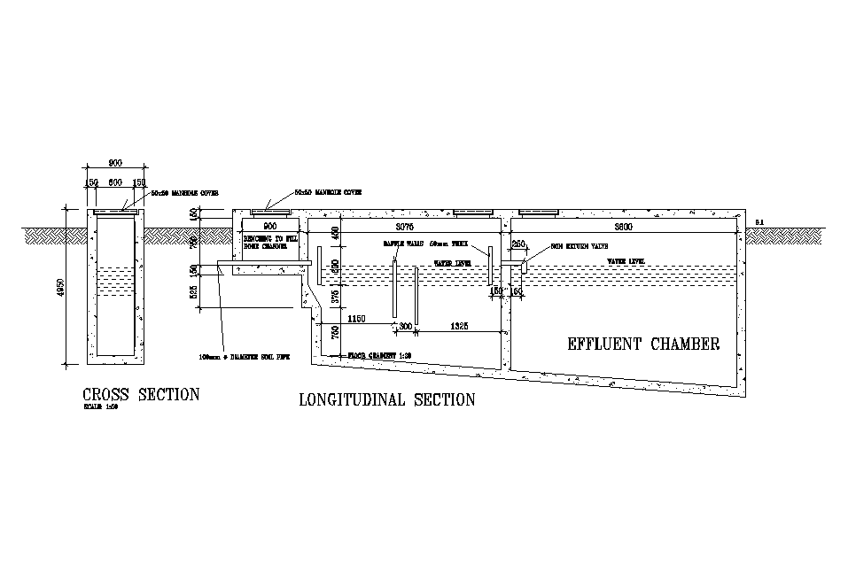 Longitudinal section view of effluent chamber is given in this Autocad drawing model. Cross section view is given. 1:20 floor gradient, 100mm diameter of soil pipe, benching to fill bore channel to septic tank, 50mm thickness of baffle wall, 50x50manhole cover, measurement details, non return valve and water level are mentioned in this drawing. For more details download the autocad drawing file. Thank you for downloading the Autocad file and other CAD program files from our website.