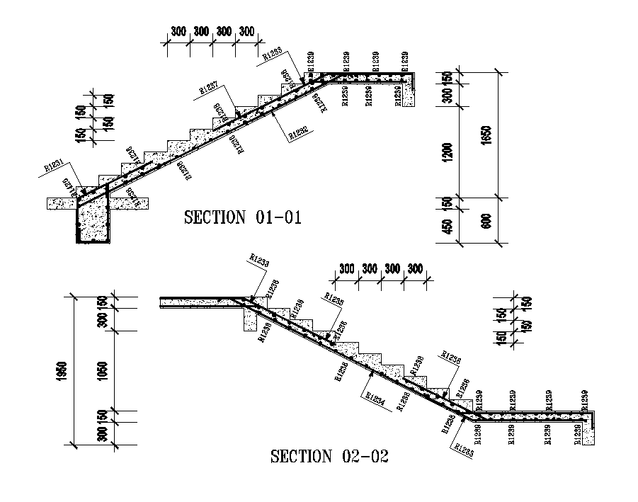 24x12m house plan staircase section view is given in this Autocad drawing model. The dimension of riser and tread is 150mm and 300mm respectively. Reinforcement detail of staircase is given. For more details download the autocad drawing file. Thank you for downloading the Autocad file and other CAD program files from our website. 2