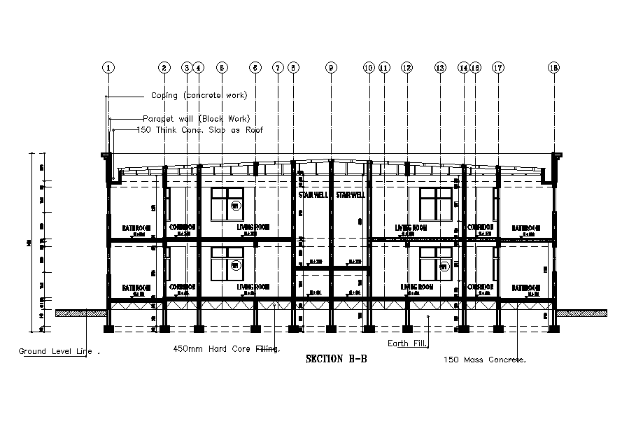 A section B B view of the 24x12m residential plan is given in this Autocad drawing file. This is G+1 house plan. The total height of the building is 7.6m. Ground level line, 450mm hard core filling, earth filling, 150mm mass concrete, coping, parapet wall, and 150mm thickness of concrete slab and other details are given in this drawing. Entrance terrace, living room, kitchen, store room, dining area, bathroom with attached toilet, kid’s room with attached toilet, and entrance lobby are available in this ground floor. Above rooms are same for the first floor. For more details download the autocad drawing file. Thank you for downloading the Autocad file and other CAD program files from our website.