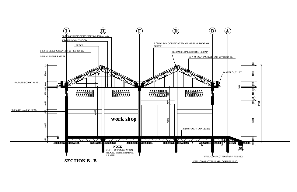 A section B to B view of 14x19m work shop plan is given in this Autocad drawing file. Download now.