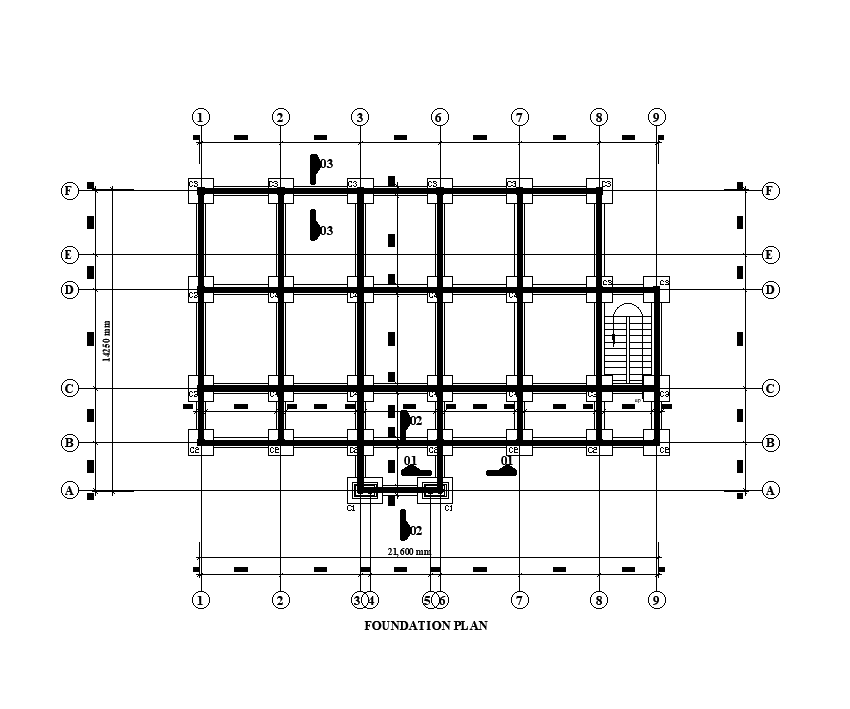 Foundation layout of 21x15m show room plan is given in this Autocad drawing file. Download now.