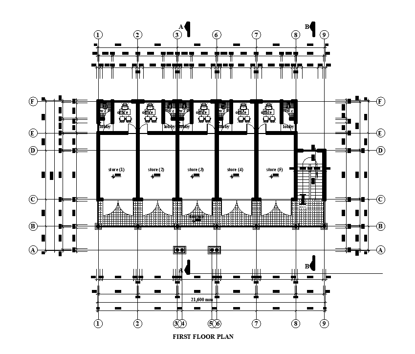 21x15m first floor show room plan is given in this Autocad drawing file. This is G+1 show room plan. 5 stores, office room with water closet, lobbies are available in the first floor. For more details download the Autocad drawing file. Thank you for downloading the Autocad file and other CAD program files from our website.
