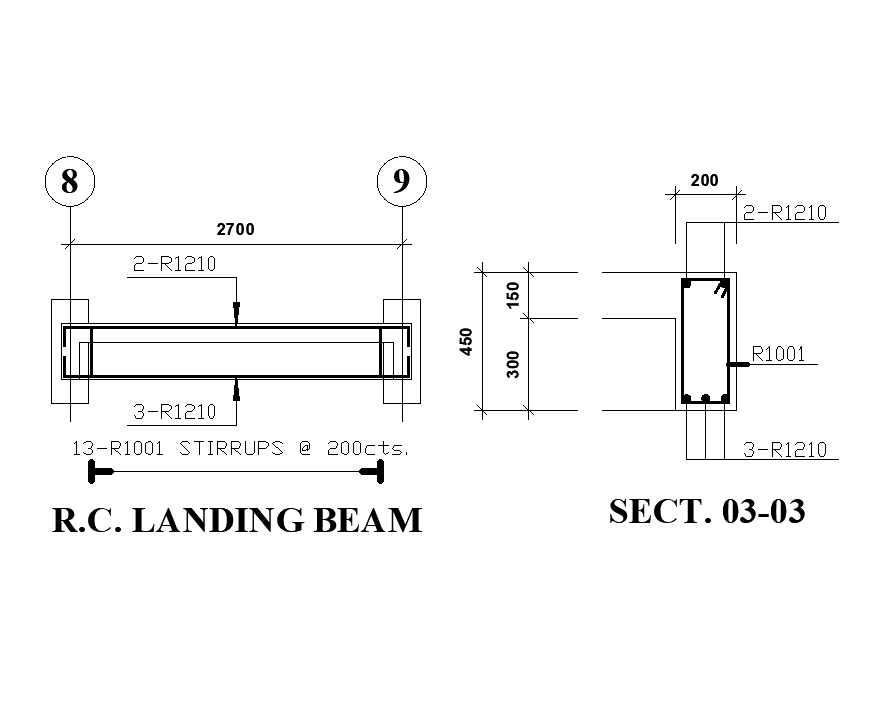 RC landing beam is given for 21x15m show room plan in this Autocad drawing model. Reinforcement details are given in this drawing. The length of the beam is 2700mm. The cross section of beam is 200x450mm. For more details download the Autocad drawing file. Thank you for downloading the Autocad file and other CAD program files from our website.
