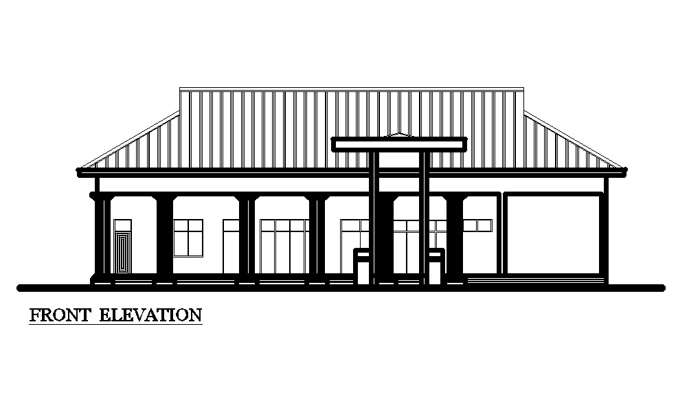 Front elevation of 25x39m shopping complex plan is given in this Autocad drawing file.Download now.