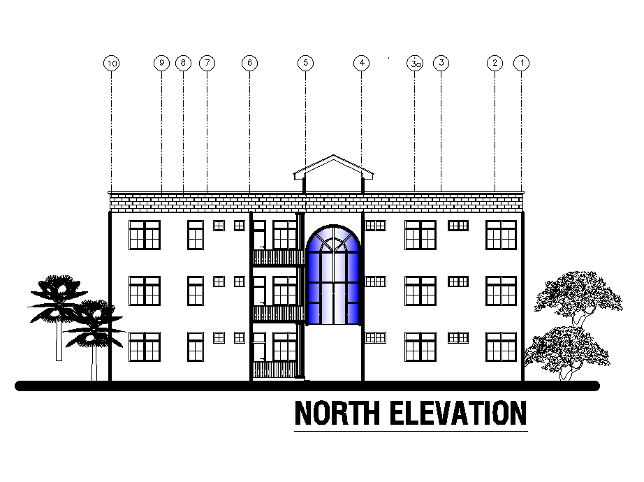 North elevation of 23x14m apartment plan is given in this Autocad drawing file. Download now.